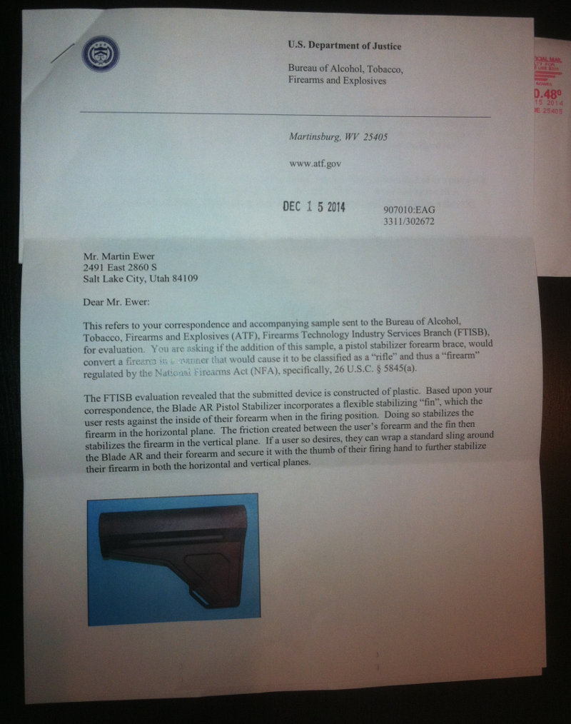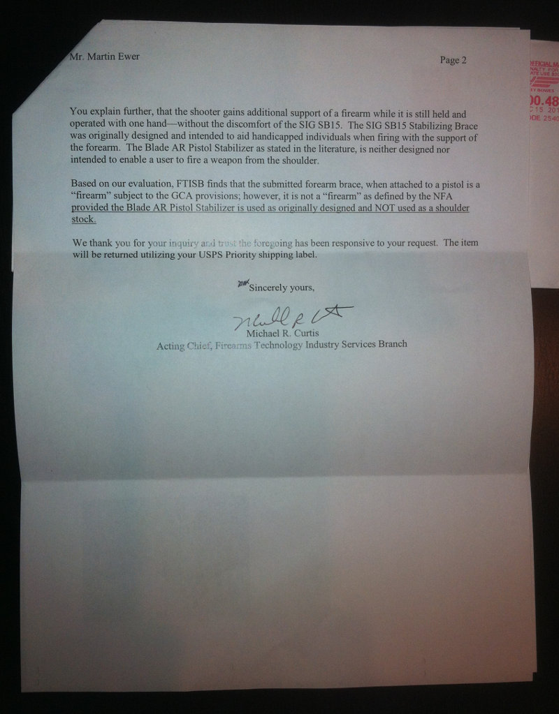 The letter notes that the literature included with the sample states the Stabilizer is not designed nor intended to enable a user to fire a weapon from the shoulder (Page 1 of the letter). FTISB correctly finds that attaching the Stabilizer does not turn the pistol into a “firearm” as defined by NFA, but then states “provided the Blade AR Pistol Stabilizer is used as originally designed and NOT as a shoulder stock.” (Emphasis added).