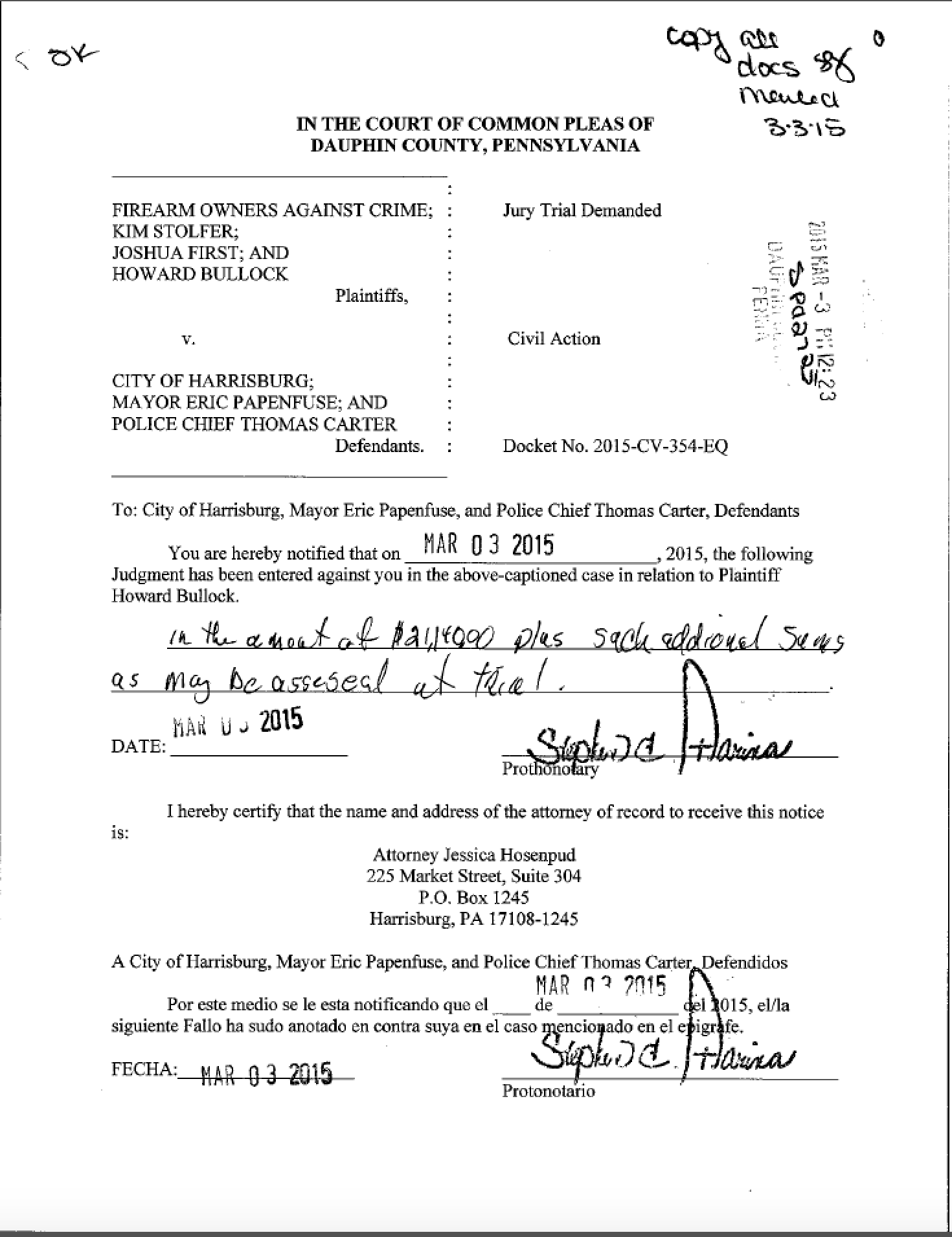 This default judgment stems from a lawsuit filed against the City of Harrisburg, Mayor Eric Papenfuse and Police Chief Thomas Carter by Firearm Owners Against Crime (FOAC), Kim Stolfer, Joshua First and Howard Bullock, as a result of their illegal firearm ordinances.
