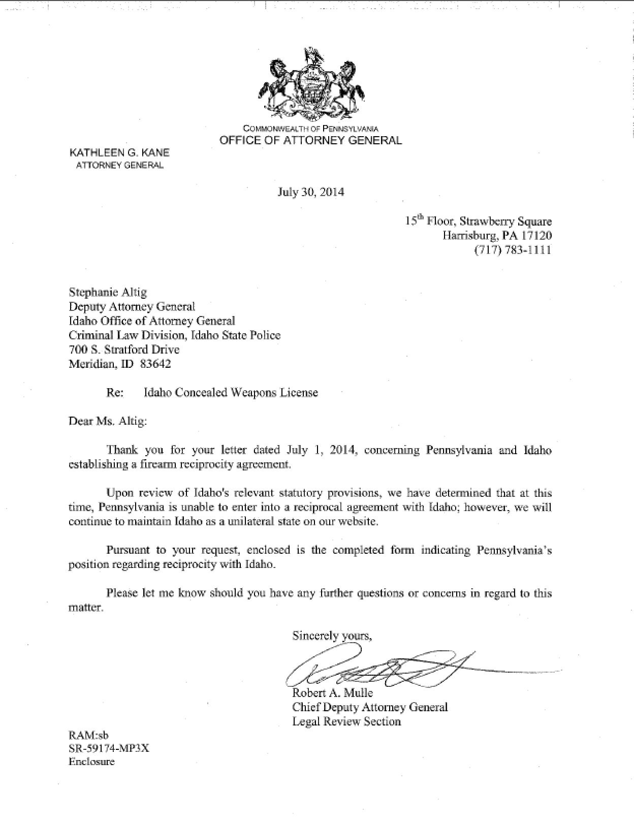 AG Response to IdahoAttorney General Kane’s refusal to explain why a reciprocal agreement is not possible is extremely disconcerting given that Idaho’s Enhanced Concealed Carry Licensing requirements far exceed the Commonwealth’s requirements for a license to carry firearms. As a result, Deputy Attorney General Altig sent a follow up letter of August 19, 2014 to Pennsylvania Chief Deputy Attorney General Robert Mulle, inquiring as to why a reciprocal agreement was not possible, based on the enhanced requirements. To this day, neither Attorney General Kane nor Chief Deputy Mulle has responded to the letter.