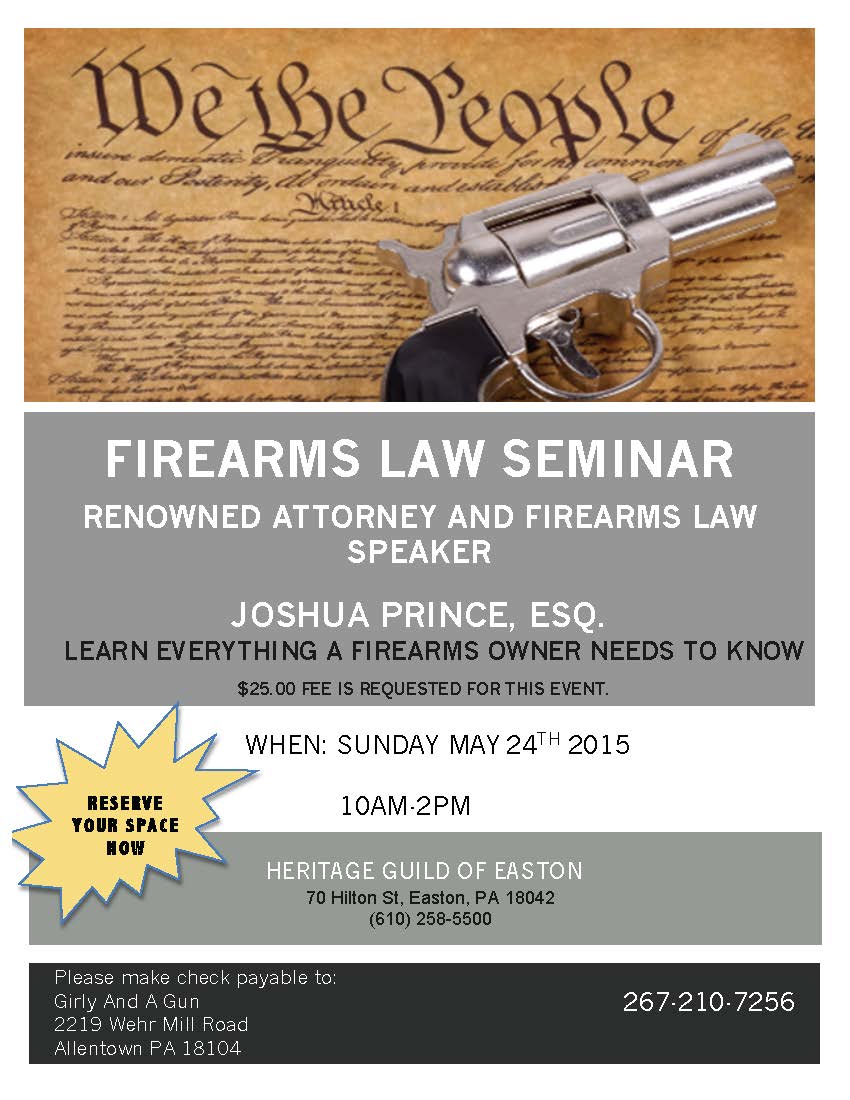 On Sunday, May 24, 2015, from 10am to 2pm, Chief Counsel Joshua Prince from the Firearms Industry Consulting Group, a division of Prince Law Offices, P.C., and Attorney Eric Winter from Prince Law Offices, P.C. will present on federal and state firearms law issues at the Heritage Guild of Easton, 70 Hilton Street, Easton, PA 18042. This seminar is being offered in support of Girly and a Gun and the Heritage Guild. The cost is $25 to Girly and a Gun. All attendees must RSVP by May 15, 2015.