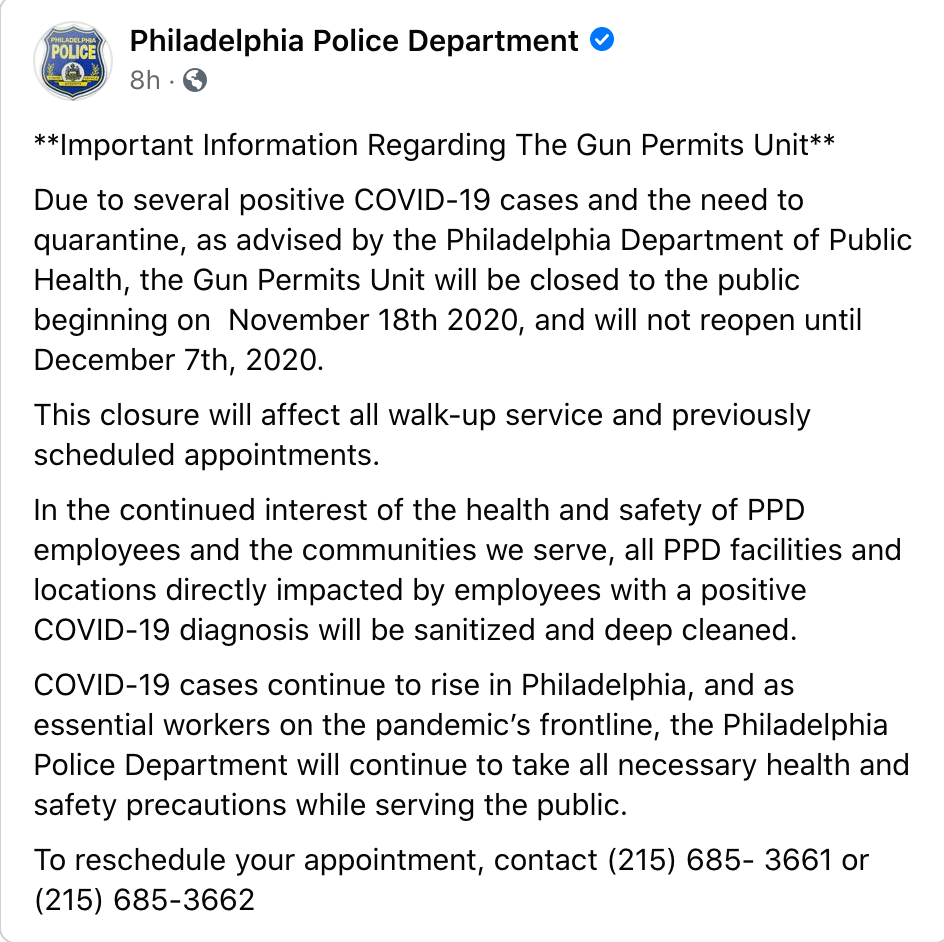 Late last night on its Facebook page, the Philadelphia Police Department posted that it was closing the Gun Permit Unit through December 7, 2020; thereby, precluding law-abiding individuals from obtaining licenses to carry firearms and therefore, subjecting them to Pennsylvania’s draconian transportation (18 Pa.C.S. 6106) and state of emergency laws (18 Pa.C.S. 6107).