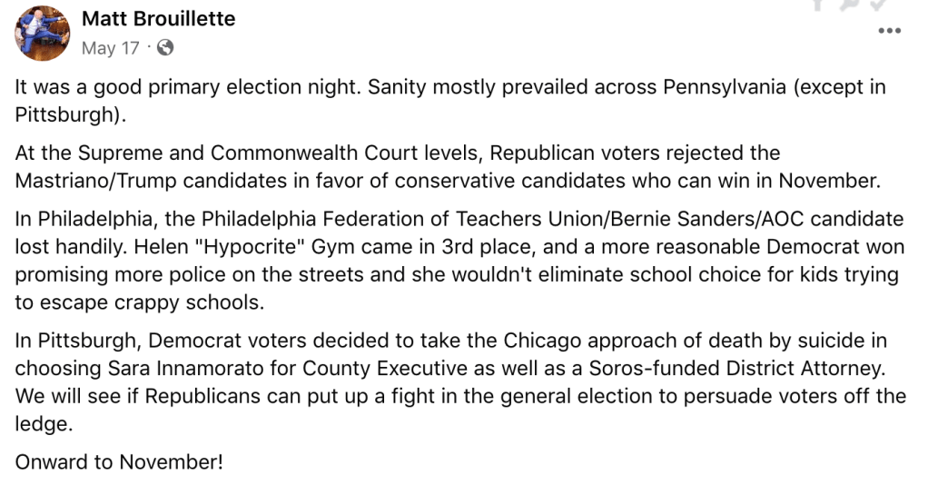 Immediately after the Primary, Brouillette posted the following on his Facebook page, and shortly thereafter, his article PA Primary Unveiled a Crisis for Both Political Parties, wherein both articles he refers to Judge McCullough and myself as the Mastriano/Trump candidates.
