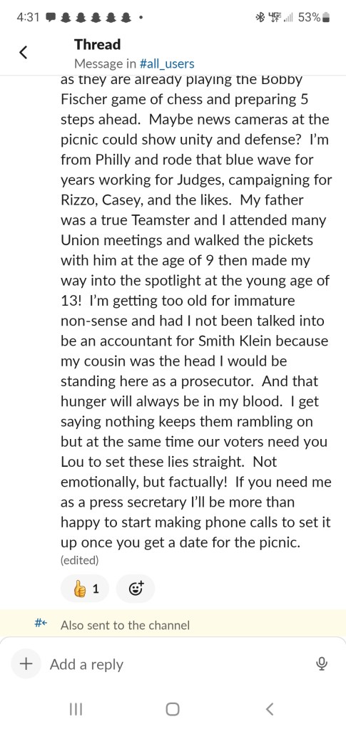 And we could go back in a time a couple months prior where then-Montgomery County Chair, attorney Liz Preate-Havey, resigned – which, per the Bylaws would automatically install the Vice Chair – but Preate-Havey named herself interim-Chair and then hired armed security for the meeting to select a new chair, where individuals, such as Stan Casacio, were threatened and effectively precluded from running against Preate-Havey’s choice for replacement. One member recounted: