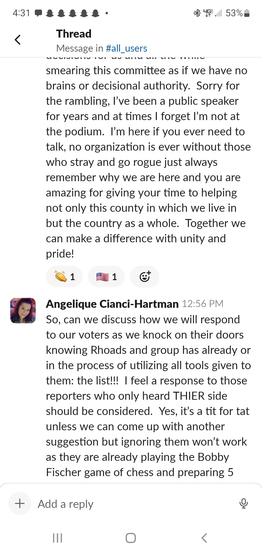 Recently, a group text exchange between Cumberland County Chair Lou Capozzi and the Cumberland County committeemembers, post-purge, was sent to me. Remember, this is the Chair, who post-purge, equated the nine unlawfully removed committeemembers and their supporters to “Antifa” and a “cancer.” In this recent exchange, Chair Capozzi bemoans the support for the unlawfully removed members in the press and otherwise and is responded to by Angelique Cinaci-Hartman, who I was informed was appointed by Chair Capozzi to fill a vacancy caused by a conservative committeemember quitting the committee rather than go through the sham expulsion hearing. What is her response? Well, it is extremely telling.