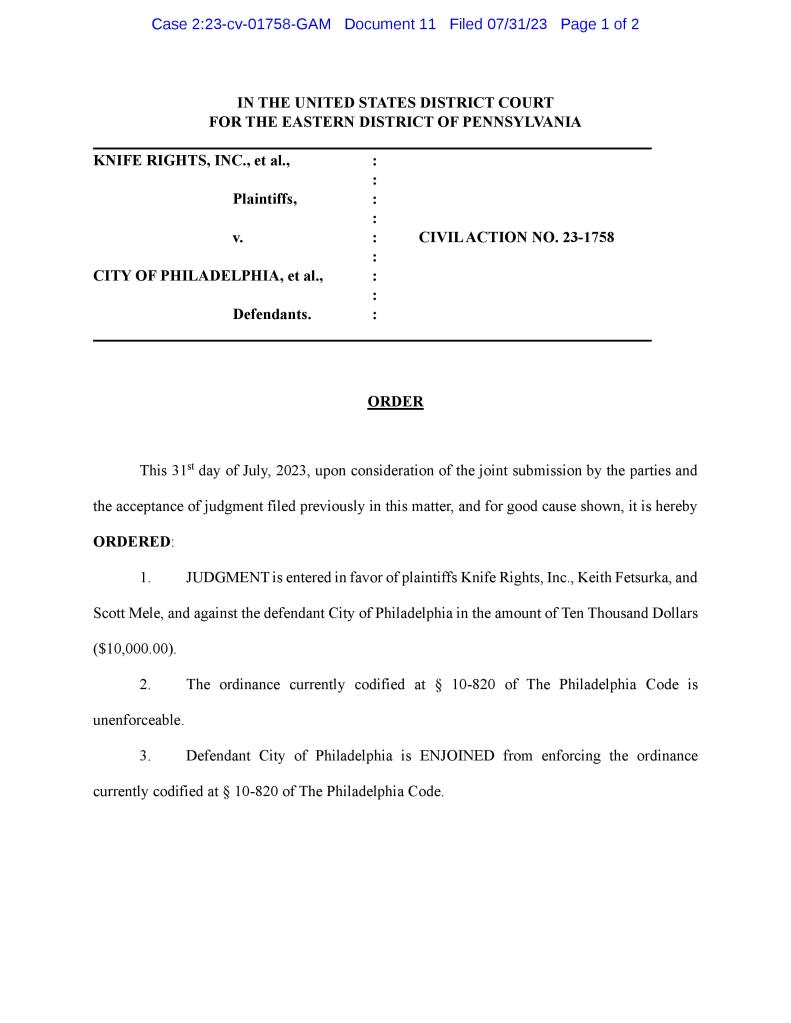 On Monday, U.S. District Court Judge Gerald McHugh issued an Order in Knife Rights, Inc., et al, v. City of Philadelphia, et al, 2:23-cv-1758 entering judgment in favor of the Plaintiffs and against the City of Philadelphia as a result of an acceptance of judgment. In essence, the City of Philadelphia, knowing it would lose the case, elected to accept judgment against it.