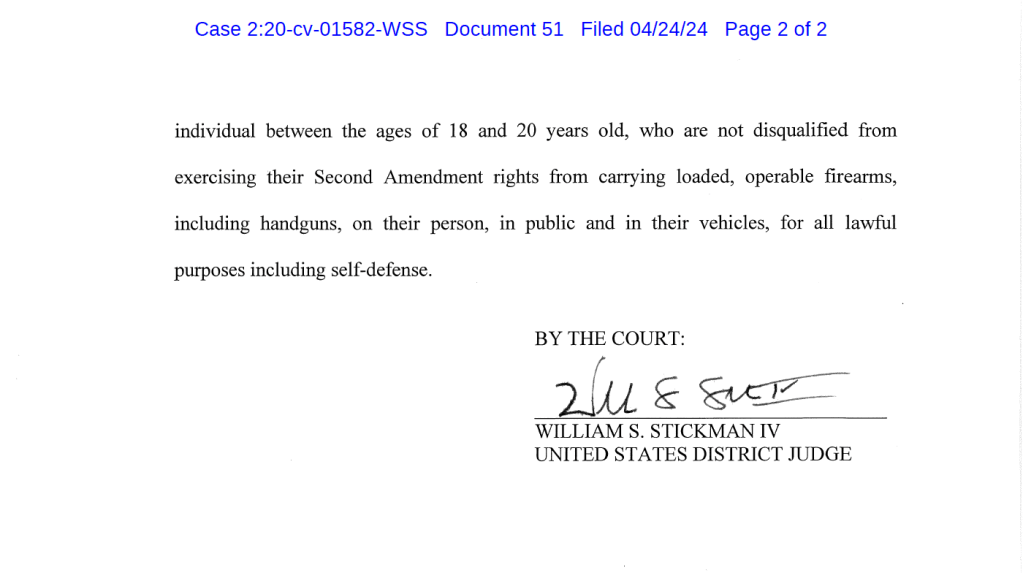 Today, Chief Counsel Joshua Prince of the Firearms Industry Consulting Group, was successful in securing a monumental permanent injunction against the Pennsylvania State Police in Lara, et al. v. PSP Commissioner, 2:20-cv-1582. The injunction precludes the Pennsylvania State Police from (1) arresting individuals between the age of 18 and 21 who openly carry firearms during a state of emergency; (2) denying applicants for a license to carry firearms merely because they are between the ages of 18 and 21; and, (3) from enforcing our draconian transportation laws (Section 6106) and state of emergency provision (Section 6107) against individuals between the ages of 18 and 21; which, as the Order specifies; thereby, allows them to “carry[] loaded, operable firearms, including handguns, on their person, in public and in their vehicles, for all purposes including self-defense.”